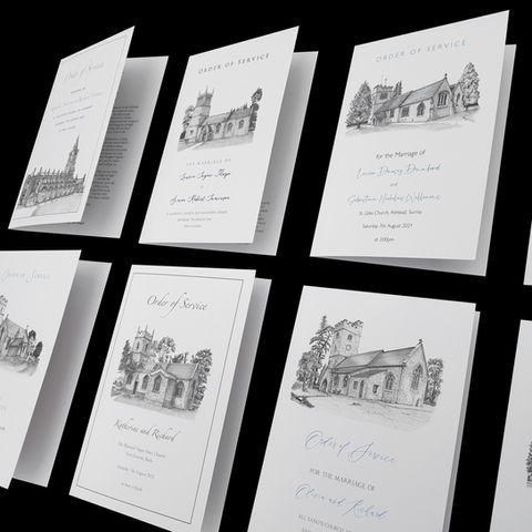 The big day is here! The one you have been dreaming of. Guide your guests through your special event in style. Let us help you wow your guests! This might be with the Order of Service featuring a church sketch, or Order of the Day, Seating Plans, Place Cards and Menus with your venue sketch and continue with your illustrated theme.